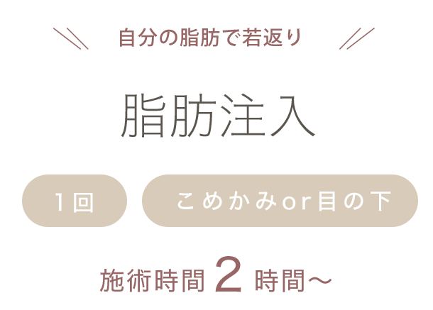 脂肪注入とは、ご自身から採取した脂肪を年齢とともにできる顔の深いしわやくぼみ、肌表面の凹みに注入することで、肌にハリを持たせて改善させる治療です。
